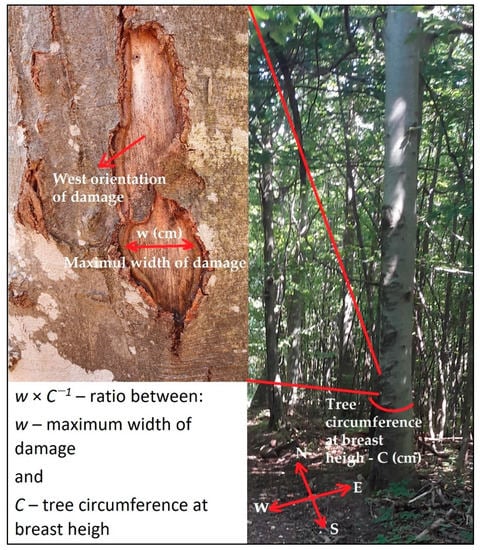 The width of the damage that was taken into account represents the maximum distance between the edges of the damage found on the trunk of the tree, measured horizontally along the circumference of the tree (Figure 3).