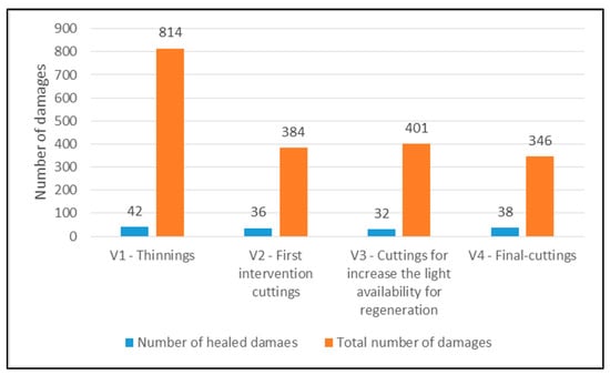 Most cases of damage were identified as thinnings (V1), where stand density was the highest (Figure 5).