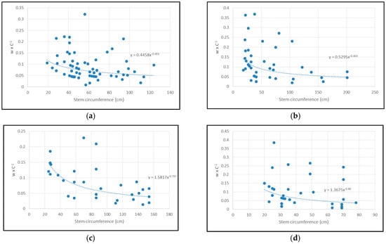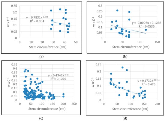 Although the variation coefficient of w × C−1 is big, a connection was observed to exist between tree circumference and the ratio between damage width and circumference (Figure 6).