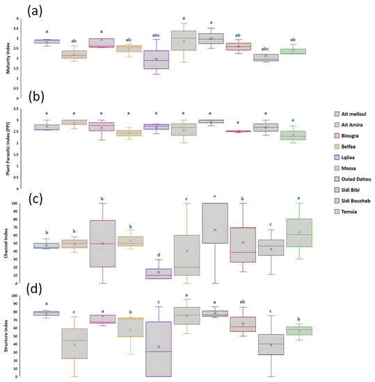 Nematode diversity patterns in sampled wheat fields of Southern Morocco. (a) Maturity index (MI); (b) plant-parasitic index (PPI); (c) channel index (CI); (d) structure index (SI). Letters represent homogeneous groups according to the LSD test (p < 0.05).