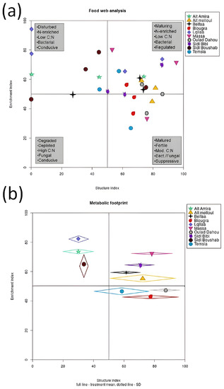 Nematode food web diagnostics and their position as soil health bioindicators. (a) Food web analysis of nematode communities at different wheat areas sampled. (b) Metabolic footprint showing the amplitudes of nematode enrichment and structure indices throughout wheat areas surveyed.