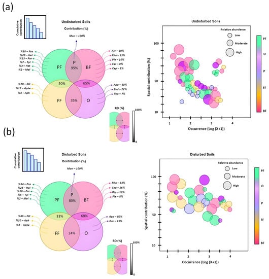 For a better understanding of soil health bioindication potential embodied within soil nematodes, spatial contribution analysis was conducted via projecting the ANOSIM and SIMPER analyses outputs. This analysis is meant to highlight the main contributors in disturbed and undisturbed wheat soils in a spatial manner (Figure 8). In undisturbed soils, plant-feeding nematodes (PF) were the most contributors with 6 taxa including Pratylenchus spp. (50%) and Helicotylenchus spp. (20%) as revealed by the unidimensional plot (Figure 8a). The contribution of bacterial feeders (BF) was explained by five taxa, mainly Acrobeles spp., Rhabditis spp., and Plectus spp. Therefore, fewer taxa were shown to operate in these soils, as fungal feeders (FF) (e.g., Ditylenchus spp. and Aphelenchoides spp.) and omnivorous nematodes (P) (e.g., Eudorylaimus spp. and Thornenema spp.) were only represented by three taxa. On the other hand, in disturbed localities, the unidimensional plot revealed the nematode contributors from each feeding type (Figure 8b). For instance, Rhabditis spp., Cephalobus spp., and Diplogasteriana spp. were most involved as bacterial feeders (BF). Fungal feeders (FF) were represented by Ditylenchus spp. (65%), Aphelenchus spp. (20%) and Aphelenchoides spp. (9%). The root-lesion nematode (Pratylenchus spp.) has dominated the plant-feeding (PF) areas by 54% followed by Helicotylenchus spp. (23%) and Paratylenchus spp. (10%). Moreover, omnivores were contributed via Aporcelaimus spp. (80%) and Dorylaimus spp. (15%), while predatory nematodes were only contributed via Mononchus spp. (100%). The multidimensional bubble plot has shown that all nematode feeding groups were spatially distributed in a hierarchic mode based on their relative abundance and occurrence. In low occurrence values, bacterial and fungal feeders were highly abundant with high contribution (90–100%) to the soil. This abundance showed different aspects (moderate to low) depending on the frequency occupied by nematodes. Plant feeders and omnivores contributed mostly to moderate frequencies. However, they extend their roles in extreme conditions where all taxa can exist altogether. Overall, the soil disturbance has revealed better nematode taxa contribution compared to undisturbed soils.