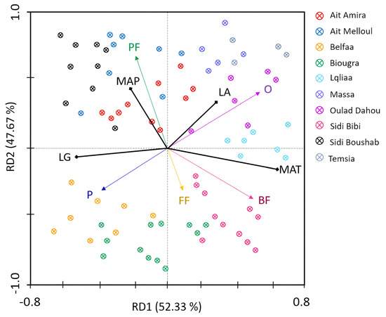 Redundancy analysis (RDA) of soil nematode taxa and environmental factor variables (LA—latitude; LG—longitude; MAP—mean annual precipitation; MAT—mean annual temperature). Soil nematodes are grouped into 4 trophic guilds (BF —bacterial feeders, FF—fungal feeders, PF—plant feeders, O—omnivores, and P—predators); Crossed circles indicate sampling localities; the bold black lines indicate environmental factors. The plot was generated by Python matplotlib and ordination libraries (skbio.stats.ordination) [61].
