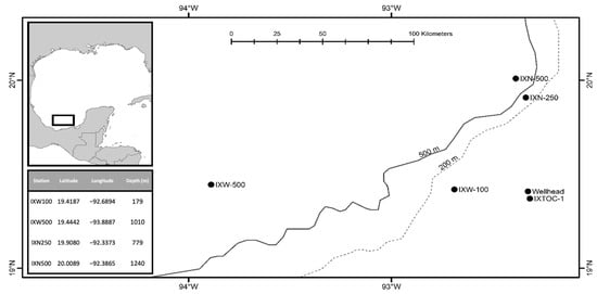 Meiofaunal harpacticoids were collected from four stations in the southern Gulf of Mexico (Figure 1). The stations were part of a study designed to determine the recovery rate of the benthic community following an oil spill. Samples were collected onboard the Universidad Nacional Autonoma De Mexico’s R/V Justo Sierra, from 30 July to 9 August, 2015. The samples were collected around the Ixtoc-1 wellhead, which was the site of the 1979 well blow out [9].