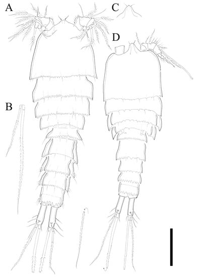 Description of Female. Total body length of holotype 328 µm (measured from anterior margin of rostrum to posterior margin of caudal rami). Largest width (184 µm) measured at posterior margin of cephalic shield. Urosome distinctly narrower than prosome (Figure 6A).