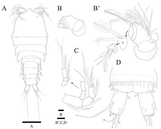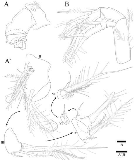 Antennule (Figure 3A,A’) seven-segmented. Segment 1 with row of strong spinules around proximal margin. Segment 2 largest. Segment 3 with aesthetasc fused basally to strong pinnate seta. All setae pinnate except for three, one, one, and four naked setae on second, fourth, fifth, and last segments, respectively. Armature formula: 1-(1 pinnate), 2-(5+9 pinnate), 3-(2 pinnate+(1+ae)), 4-(1+2 pinnate), 5-(1+2pinnate), 6-(1+1pinnate), 7-(4+1 pinnate+1 acrothek). Apical acrothek consisting of one well-developed but small ae fused basally to strong and stout pinnate seta, and bare seta.