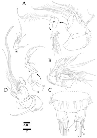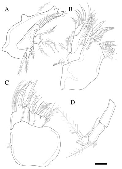 Zosime montagnai sp. nov. (A) Mandible; (B) Maxillule; (C) Maxilla; (D) Maxilliped. Scale bar: 10 µm.