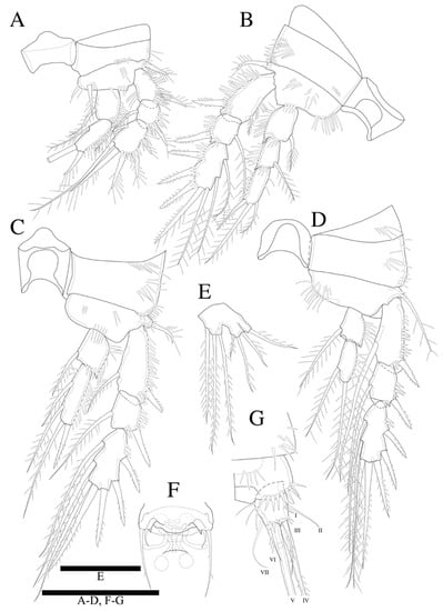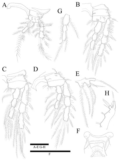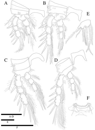 Swimming legs 1–4 (Figure 5A–D) biramous, with three-segmented exopods, and P1 with two-segmented endopod, P2–P4 with three-segmented endopods and with wide intercoxal sclerites, and well-developed triangular praecoxae. Coxae and bases with anterior rows of surface spinules as illustrated, the former rectangular.