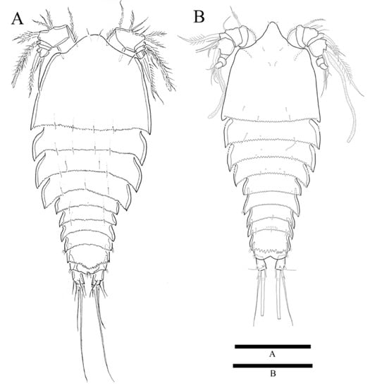 The descriptive terminology of Huys et al. [10] was adopted. Abbreviations used in the text are as follows: A1, antennule; A2, antenna; ae, aesthetasc; exp, exopod; enp, endopod; P1–P6, first to sixth thoracopod; exp (enp)-1 (2, 3) to denote the proximal (middle, distal) segment of a three-segmented ramus. Specimens were deposited in the National Marine Biodiversity Institute of Korea (MABIK). Scale bars in figures are in µm.