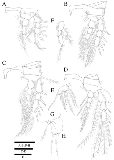 Zosime thistlei sp. nov. Female. (A) P1; (B) P2; (C) P3; (D) P4; (E) P5. Male. (F) P2 endopod; (G) P5; (H) P6. Scale bars: 50 µm.