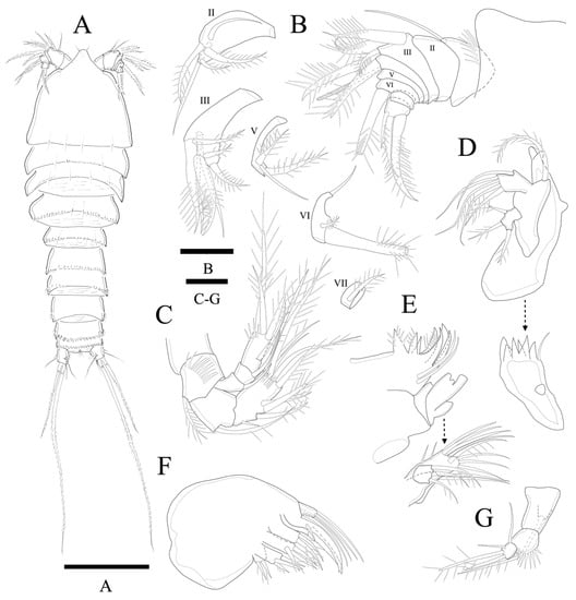 Caudal rami (Figure 6A and Figure 7C) as long as anal somite, and slightly longer than wide; setae I and II arising laterally halfway along outer margin, seta I smallest; seta III as long as seta II; seta IV basally fused to seta V; seta V longest and slightly longer than all urosomites combined; seta VI shorter than seta III and located on distal inner corner; seta VII bare, located dorsally, triarticulated.