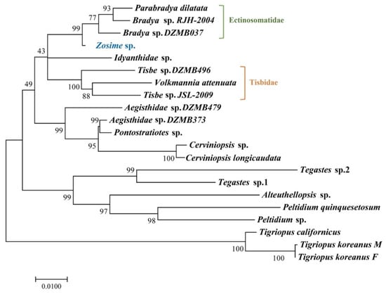 To infer the molecular phylogenetic relationship between Zosimeidae and the morphologically and taxonomically related families, NCBI uploaded data were used, and as a result, it was confirmed that they were closely related to Ectinosomatidae, Idyanthidae, and Tisbidae. For accurate molecular phylogenetic studies, future molecular studies with more molecular markers and various species will be needed.