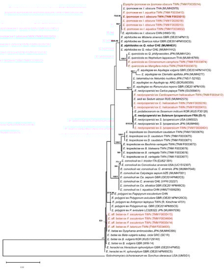 A best-scoring ML tree of ITS with a final optimization likelihood of −1646.264627 is shown in Figure 1. The PMs on I. obscura and I. aquatica from Taiwan were clustered with P. ipomoeae on I. obscura (MUMH2978) from Thailand []. Our samples on F. esculentum and F. tataricum were grouped in a clade with E. betae (Vaňha) Weltzien on other host plants belonging to Amaranthaceae [,], distinguished from those in the clade of E. heraclei DC. and E. polygoni DC. [,,,]. Besides, the PMs on C. halicacabum were grouped with species in the E. aquilegiae complex [,,].