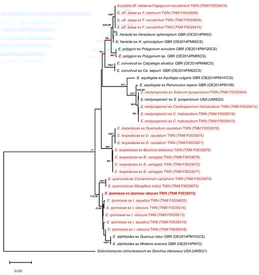 RAxML tree based on ITS sequences from Erysiphe. Golovinomyces cichoracearum is used as an outgroup taxon. Maximum likelihood bootstrap values ≥70% and Bayesian posterior probabilities ≥0.95 are given at the nodes. Sequences obtained in this study are shown in red. Ex-type sequences are indicated in bold.