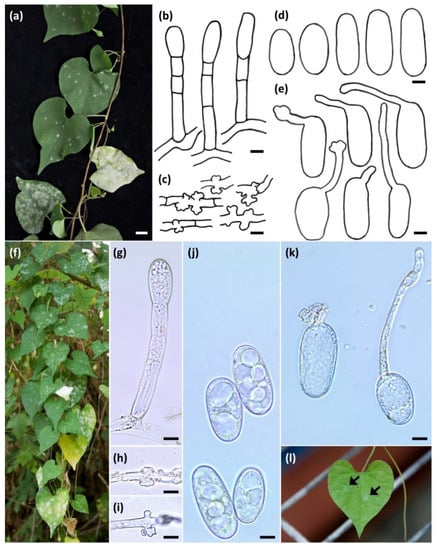 Erysiphe ipomoeae on Ipomoea obscura. (a) Symptoms of E. ipomoeae on I. obscura, TNM 0035015, neotype. (b–e) Drawings showing microscopic characteristics of TNM 0035015. (b) Conidiophores with conidia. (c) Hyphal appressoria. (d) Conidia. (e) Conidia with germ tubes. (f) Symptoms of the powdery mildew on naturally infected plant in field. (g–k) Micrographs of E. ipomoeae on I. obscura TNM 0035015. (g) Conidiophore with conidium. (h,i) Hyphal appressoria. (j) Conidia. (k) Conidia with germ tubes. (l) The symptoms on I. obscura inoculated with E. ipomoeae on I. obscura. Scale bars in (a) = 1 cm, in (b–e), and (g–k) = 10 μm. Arrows indicate the colonies of the powdery mildew.