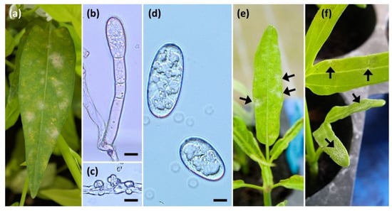 Erysiphe ipomoeae on Ipomoea aquatica. (a) Symptoms of the powdery mildew on naturally infected plant in greenhouse. (b–d) Micrographs of E. ipomoeae on I. aquatica TNM 0034602. (b) Conidiophore with conidium. (c) Hyphal appressoria. (d) Conidia. (e) The symptoms on I. aquatica inoculated with E. ipomoeae on I. obscura. (f) The symptoms on I. aquatica inoculated with E. ipomoeae on I. aquatica. Scale bars in (b–d) = 10 μm. Arrows indicate the colonies of the powdery mildew.