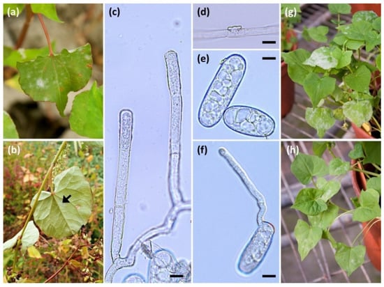 Erysiphe aff. betae on Fagopyrum spp. (a–b) Symptoms of the powdery mildew on naturally infected plant F. esculentum and F. tataricum in field, respectively. Arrow indicates the symptoms of the powdery mildew. (c–f) Micrographs of E. aff. betae on F. esculentum TNM 0034604. (c) Conidiophores with conidia. (d) Hyphal appressorium. (e) Conidia. (f) Conidium with germ tube. (g) The symptoms on F. esculentum inoculated with E. aff. betae on F. esculentum. (h) The symptoms on F. tataricum inoculated with E. aff. betae on F. esculentum. Scale bars in (c–f) = 10 μm.