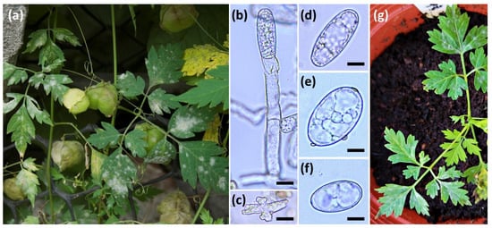 Erysiphe neolycopersici on Cardiospermum halicacabum. (a) Symptoms of the powdery mildew on naturally infected plant in field. (b–f) Micrographs of E. neolycopersici on C. halicacabum TNM 0035016. (b) Conidiophore with conidium. (c) Hyphal appressoria. (d–f) Conidia. (g) The symptoms on C. halicacabum inoculated with E. neolycopersici on C. halicacabum. Scale bars in (b–f) = 10 μm.