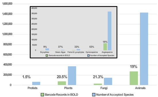 Numbers of species and DNA barcodes across the Tree of Life. The number of species in each of the four major groups of organisms on Earth (blue bars) according to the Catalog of Life are given along with the number of published barcode sequences in BOLD (green bars). Inset shows the major green plant clades (blue bars) with the number of barcode sequences in BOLD (green bars) adjacent to the number of accepted species (according to [11]). The estimated percentage of all species with DNA barcode sequences for that group is provided above the bars in this plot.