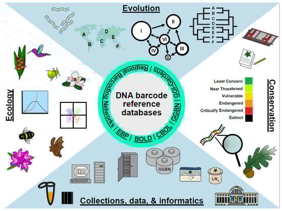 The organization of DNA barcoding projects has often followed geopolitical boundaries and the most common denominator for large sequence programs reflects local, regional, or national funding structures. Some examples of these at a regional and national levels include the African Centre for DNA Barcoding (https://www.acdb.co.za/, accessed on 26 January 2022 [40]), the Canadian Centre for DNA Barcoding (https://ccdb.ca/, accessed on 26 January 2022), and the China Plant BOL (Barcode of Life) Group [41]. In a similar way, the United Kingdom’s Darwin Tree of Life Project (https://www.darwintreeoflife.org/, accessed on 26 January 2022 [42]) takes a geopolitical approach toward their goal to sequence the whole genomes of all eukaryotic species in Britain and Ireland. These focused, localized research networks contribute to international goals that help support the shared priority of advancing a global understanding of biodiversity and facilitate the use of DNA barcodes and other genetic tools for broader ecological, evolutionary, and conservation purposes.