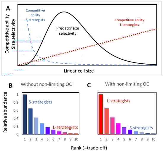 (A) Schematic illustration of the proposed mechanism whereby S- and L-strategists decrease the trade-off between competition and defense by reducing or increasing size, respectively. The size-increase of L-strategists requires access to sufficient non-limiting organic C (OC). For S-strategists, competitive ability is assumed to scale with r−2. With a size below the peak in prey selectivity, a further decrease in size will increase competitiveness and simultaneously reduce predator loss. For L-strategists where competitiveness scales with r1, a reduction in trade-off is obtained if size increases above the peak in predator selectivity. With rank (in abundance) dependent on trade-off, the usually (B) S-dominated (blue) rank-abundance curves shift to (C) L-dominated (red) in environments with sufficient non-limiting OC.