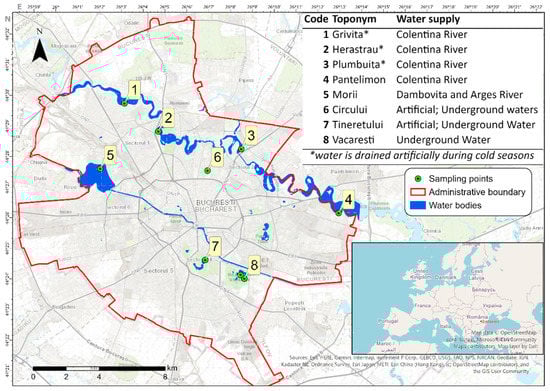 Location of the studied ecosystems and sampling stations (1—Grivița*, 2—Herăstrău*, 3—Plumbuita*, 4—Pantelimon, 5—Morii, 6—Circului, 7—Tineretului, 8—Văcărești). *—water is drained artificially during cold seasons.