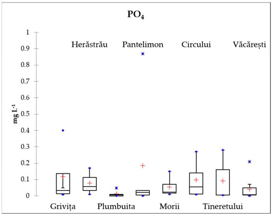 Boxplots of the assessed nutrients NO3 (mg N L−1), NH4 (mg N L−1) and PO4 (mg P L −1) assessed in eight urban lakes of Bucharest city (Blue points—outliers; red crosses—means; lower and upper limits—first and third quartiles; central horizontal bars—medians).