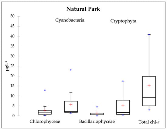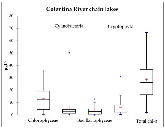 Boxplot of in situ Chlorophyll-a (µL−1) for each type of ecosystem over the entire sampling period (Blue points—outliers, red crosses—means; lower and upper limits—first and third quartiles; central horizontal bars—medians).