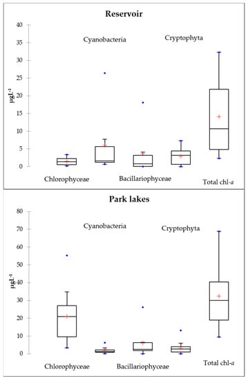 The eutrophication of the urban lakes results from the input of nutrients from various sources and high residence time of water, as well as various other factors in adjacent areas [57]. Temperature and nutrients are known as controlling drivers in algae growth. Rising temperature stimulates phytoplankton productivity, doubling the growth rates with each 10 °C, and above 25 °C Cyanobacteria become prevalent [58,59]. The availability of nutrients for the development of phytoplankton assessed by RDA multivariate analysis highlighted the preference of green algae and diatoms for nitrogen and orthophosphate but in conditions of cold periods, while Cyanobacteria and Cryptophyta have been associated with higher-temperature periods and nitrogen nutrients (Figure 4). Eutrophication conditions by Chlorophyll-a were present in all study seasons, with higher frequency in autumn (Table 2), and in many cases were not associated with increases in one of the nutrients. Thereby, the phytoplankton communities consume nutrients in the development processes but were still responsible for the deterioration of water quality to a greater extent than the mentioned chemical parameters.