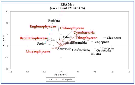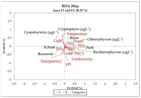 Redundancy analysis (RDA) for physicochemical parameters influencing the phytoplankton community biomass (μgL−1). Red lines—explanatory variables (X) of the variation of phytoplankton communities.