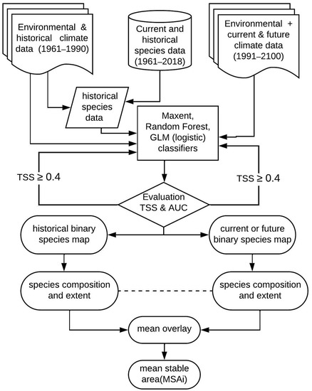 We adapted the EUROMOVE modelling approach to predict species richness from 1990 to 2100 and then calculated the mean stable area index (MSAi). The EUROMOVE model, as mentioned earlier, is a European regional model for higher vascular plants. The model was used to capture changes in species composition from the additive overlay of binary species maps for different modelling periods. It calculated the mean area covered by species for each modelling period and then aggregated these outputs into the mean stable area indicator. Thus, on the regional scale, the model predicted both appearing and disappearing species in each European country based on the regional species pool. In the case of the Czech Republic, species distribution was estimated on grids of about 500 m2. We replaced logistic regression with the maximum entropy algorithm—Maxent [37,38], accepting all default settings. Maxent optimises prediction by comparing the probability density of environmental conditions where a species is observed to the probability density of background environmental conditions in an area based on minimum distance [40]. Thus, we sampled 10,000 background points and their environmental attributes for each species and implemented Maxent in R from the dismo package [41]. Before modelling, we randomly partitioned (without replacement) 70% of each of the 1171 species datasets for model training and 30% for model evaluation. We used the trained model to predict species richness for subsequent periods. We also assessed selected species’ response to climate-environmental gradients using Random Forest [42,43] and logistic regression [44,45]. Random Forest is based on an ensemble of decision trees built on different bootstrapped samples and predictors. The algorithm is robust to nonlinear variation and depends on the most votes from decision trees to classify unique cases in an observation. In contrast, logistic regression is a flexible extension of linear models with the possibility to handle nonlinear variation and different families of probability distribution in the data [44]. Thus, we studied response curves from the best of the three modelling approaches and further assessed landscape vulnerability as the net loss or gain of the simulated current and future climate space. The workflow is summarised in Figure 1.