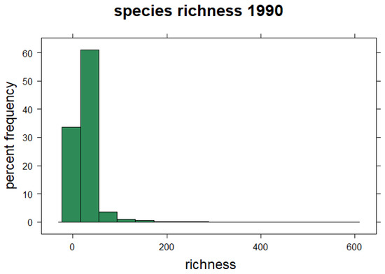 Frequency of species richness in the Czech Republic. The distribution is based on 1117 representative species, each with at least 50 observations.
