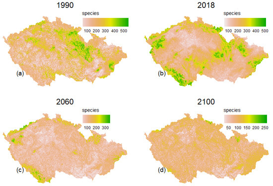 Spatial shifts in species richness: (a) baseline period (1990), (b) to the current pattern (2018) (c) near distant future (2060) and (d) far distant future (2100). Future changes are based on the (RCP 8.5) climate scenario.