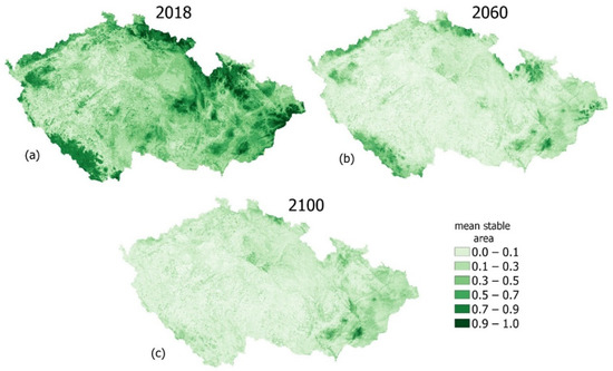 The variability in MSAi values has reaffirmed that the most stable areas of the Czech Republic are currently in protected and mountainous areas (Figure 5f,g,h). Their current MSAi values range from 0.7 to 0.94 and may drop from 0.5 to 0.8 by 2100 without intervention or mitigation efforts. Lowlands with the least species variety are the least stable and the most vulnerable. Our results show more variability in the MSAi ratio for the Czech Republic than the regional EUROMOVE model for Europe [2,5]. A possible reason for the difference could be that we modelled change based on 686 species for the Czech Republic compared to 430 species for the entire Czech Republic, Slovakia, and Hungary in the regional EUROMOVE model [2]. The extra details also highlight the benefits of using high-resolution climate and environmental data to account for local variations [6,54].