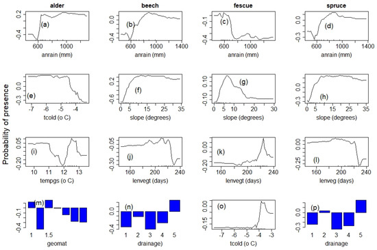 Species response to climate and environmental gradient: panel 1: alder; panel 2: beech; panel 3: fescue; panel 4: spruce; “anrain” = annual rainfall; “tcold” = average minimum temperature; “tempgs” = temperature of the growing season; “lenvgt” = length of the vegetation period and “geomat” = geological material. (a–d) annual rainfall, (e,o) average minimum temperature, (f–h) variation with slope angle, (i) average temperature of the growing season, (j–l) length of the vegetation season in days, (m) geological material scaled from 0 for very coarse to 1.9 for very fine material, (n,p) soil drainage scaled from 1 for poorly drained to 5 for well-drained soils.
