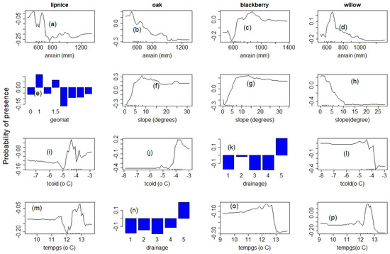 Species response climate and environmental gradient: panel 1: lipnice; panel 2: oak; panel 3: blackberry; panel 4: willow; “anrain” = annual rainfall; “tcold” = average minimum tempera-ture; “tempgs” = temperature of the growing season; “lenvgt” = length of the vegetation period; and “geomat” = geological material. (a–d) annual rainfall, (e,o) average minimum temper-ature, (e) geological material scaled from 0 for very coarse to 1.9 for very fine material, (f–h) slope angle, (i,j,l) average minimum temperature, (k,n) soil drainage scaled from 1 for poorly drained to 5 for well-drained soils, (m,o,p) average temperature of the growing season.