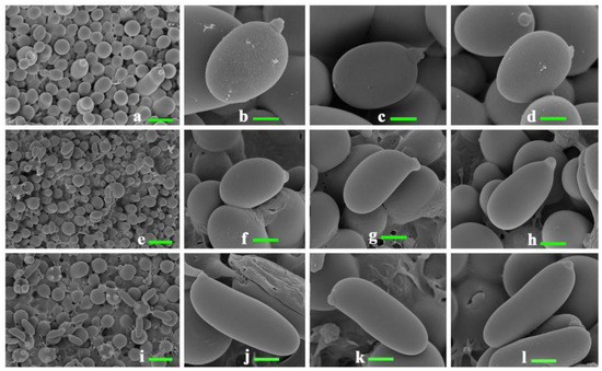Characteristics of fresh basidiospores under SEM. (a–d) Agaricus bisporus; (e–h) Lentinula edodes; (i–l) Pleurotus ostreatus. Scale bars: (a,e,i), 10 μm; (b–d,f–h,j–l), 2 μm.