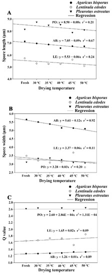 There were significant differences among the length and width of basidiospores of A. bisporus, L. edodes, and P. ostreatus with respect to different drying temperatures of fruitbodies (Table 1). The relationship between basidiospore length, width, Q value, and drying temperature was quantified and is shown in Figure 2.