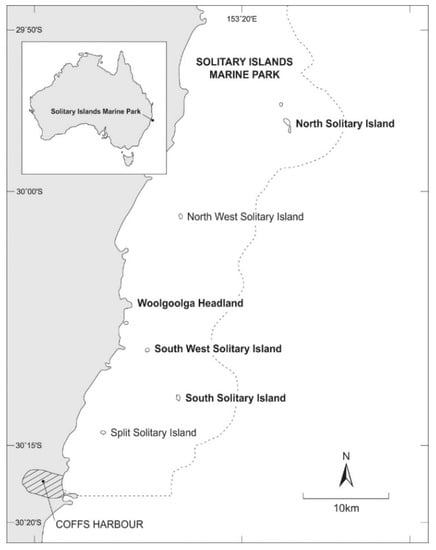 The SIMP lies on the subtropical east coast of Australia (Figure 1) and covers estuarine, shore and subtidal habitats. Marine communities comprise a mix of algal-dominated habitats close to shore [] with increasing representation of more tropically affiliated species offshore [,]. The outer islands (North and South Solitary islands; Figure 1) are regularly influenced by the southward-flowing East Australian Current (EAC) and thus experience water temperatures that are 1–1.5 °C higher than nearshore locations []. The influence of the EAC is cited as a key reason for the dominance of hard corals around the mid-shelf and offshore islands with coral cover approaching that of more tropical locations at several sites []. Range extensions have been reported for a number of taxa over the past decade but, although there has been a progressive loss of macroalgal cover at a few mid-shelf sites [], coral-dominated communities at the outer islands show no evidence of broadscale tropicalisation []. A thriving diving industry and a dedicated group of underwater volunteers [] ensure that most main island sites are regularly visited with the consequent likelihood that novel or unusual species will be observed and reported. It is against this backdrop that we evaluated the list of taxa recorded during the recent Coffs Coast Sea Slug Census with a specific focus on species recorded for the first time and south of their previously documented range.