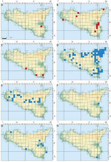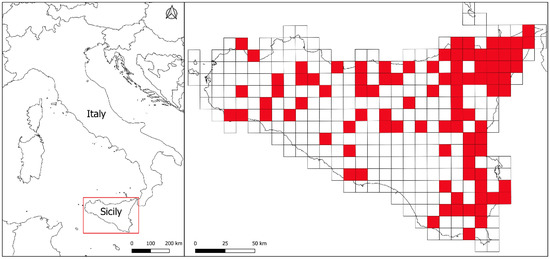 Occurrence localities were used to produce distribution maps based on the UTM 10 × 10 Km grid cells (zone 33N, datum ED50) using the QGIS freeware software v. 3.18 (QGIS Development Team, 2022 [20]).