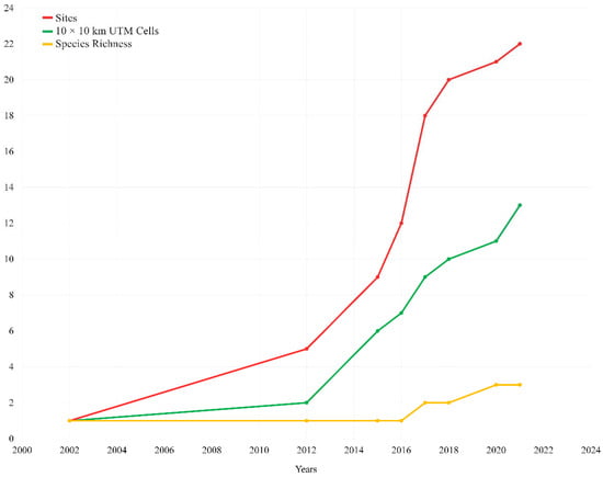 Cumulative curves of decapod NIS occurring in Sicily, from the first reported record in 2002 to today, based on “Sites” (red line), “10 × 10 km UTM cells” (green line) and “species richness” (yellow line) data (see also Table 1).