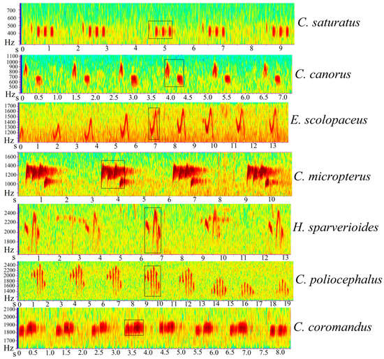 Spectrograms of seven Cuculidae birds from eastern China. The X-axis represents the time in seconds, and the Y-axis represents the frequency in kHz. The sound files can be found in Supplementary Materials and the Spectrograms were made by Raven Pro Version 1.5 software [30]. Examples of calls are shown in black box.