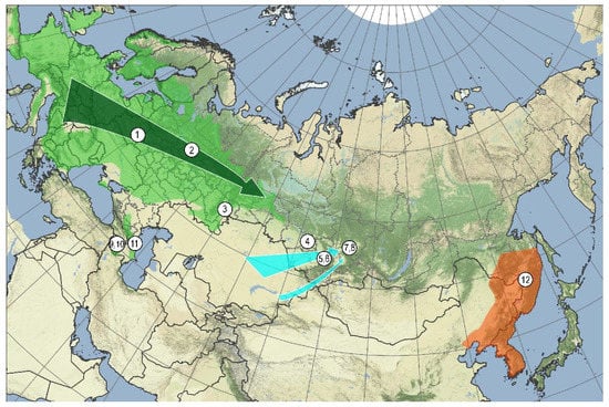 Sampling locations of the studied Tilia specimens. Location numbers in circles refer to Table 1. Distributions of T. sibirica and T. nasczokinii are too small so they are only represented by location circles (locations 5, 6 and 7, 8, respectively). Distribution of T. cordata is shaded in green; distribution of T. taquetii and T. amurensis is shaded in red. Arrows indicate putative dispersal routes of T. cordata after the LGM.