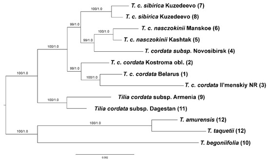 Several molecular studies attempted to clarify this issue. Logan et al. [14] employed 12 microsatellite loci to compare T. sibirica from the Kuzedeevo Linden Island to three T. cordata populations from Austria, Poland, and West Siberia. T. sibirica was found to differ significantly from T. cordata, with the divergence time between them estimated at 447 kya (95% confidence interval, 154–901 kya). Semerikova et al. [15] used RFLP of amplified plastid genes to find that T. sibirica had one of the haplotypes characteristics for T. cordata.