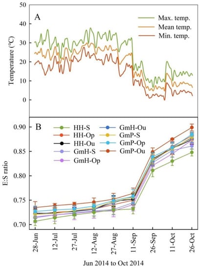 The initial E: S ratio (28 June) for fresh seeds of each pollination type ranged from 0.707 ± 0.009 for selfed seeds of HH to 0.735 ± 0.018 for outcrossed seeds of GmP, and differences among pollination types were not significant (Table 1, Figure 3).