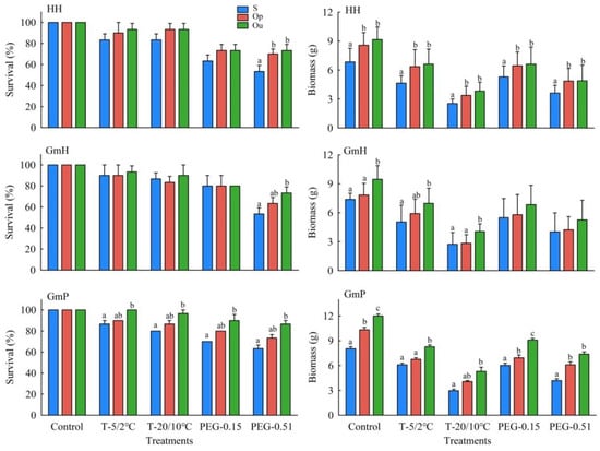 Mean (±SE) seedling survival (left) and biomass (right) of offspring from seeds of selfed (S), open pollinated (Op) and crossed (Ou) flowers of Eremurus anisopterus under different stress conditions. HH, hermaphrodite flowers on hermaphrodite plants; GmH, hermaphrodite flowers on gynomonoecious plants; GmP, pistillate flowers on gynomonoecious plants. Different letters above each group indicate significant differences between pollination types within each treatment (p < 0.05). Marginally significant differences are not shown here.