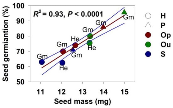 Relationship between seed mass and seed germination in Eremurus anisopterus. Red lines show linear regressions, and blue lines show ± 95% confidence intervals. He—hermaphrodite plants; Gm—gynomonoecious plants; H—hermaphrodite flowers P—pistillate flowers; S—selfed—Op—open pollinated; Ou—crossed.