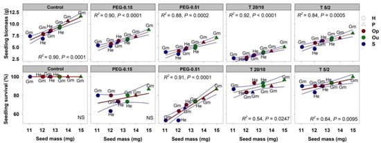 Relationship between seed mass and seedling survival and biomass in Eremurus anisopterus. Red lines show linear regressions, and blue lines show ±95% confidence intervals. NS, no significant difference. Abbreviations as in Figure 5.