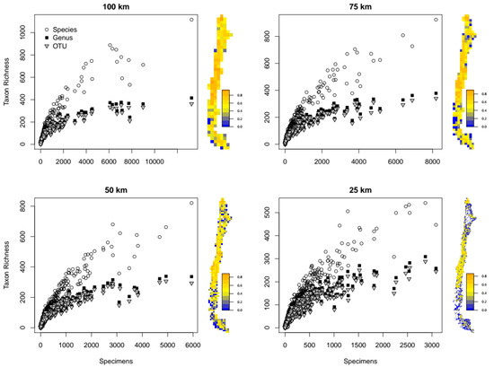 Taxon richness plotted as a function of number of specimens at different taxonomic levels (species, genus and OTU) and spatial resolutions (100, 75, 50 and 25 km grid cells). Maps next to the charts show the spatial distribution of species redundancy for the corresponding resolution.