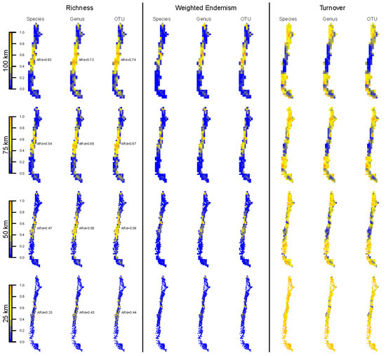 The following supporting information can be downloaded at: https://www.mdpi.com/article/10.3390/d14040271/s1. Figure S1. Pairwise comparisons of average redundancy and average fuzzy Kappa values between the original grid and two additional shifted grids. Both redundancy and fuzzy Kappa range between 0 and 1. The line indicate equal values for the two grids. Figure S2. Log-log relation between taxon richness and weighted endemism at different taxonomic levels (Species, Genus, OTU) and spatial resolutions (100, 75, 50, 25 km grid-cells). Gray lines are density plots. Figure S3. Relation between taxon richness and turnover at different taxonomic levels (Species, Genus, OTU) and spatial resolutions (100, 75, 50, 25 km grid-cells). Note the log scale of the y-axis. Gray lines are density plots. Figure S4. Log-log relation of richness of species versus genus and OTU at different spatial resolutions (100, 75, 50, 25 km grid-cells). Gray lines are density plots. Figure S5. Log-log relation of weighted endemism of species versus genus and OTU at different spatial resolutions (100, 75, 50, 25 km grid-cells). Gray lines are density plots. Figure S6. Log-log relation of turnover of species versus genus and OTU at different spatial resolutions (100, 75, 50, 25 km grid-cells). Gray lines are density plots. Figure S7. Relation between agreement (numerical fuzzy Kappa index) and ratio of species to genera and species to OTUs at different spatial resolutions (100, 75, 50, 25 km grid-cells). Figure S8. Average spatial agreement measured with the Fuzzy Kappa index for Taxon Richness, Weighted Endemism and Taxon Turnover, based on specimens data. Cross comparisons between taxonomic levels and spatial resolutions in both directions. A–C: lower resolution corresponds to the first taxonomic level. D–F: higher resolution corresponds to the first taxonomic level. Figure S9. Average spatial agreement measured with the Fuzzy Kappa index for Taxon Richness (left panel), Weighted Endemism (middle panel) and Turnover (right panel), based on specimens data between mobile windows and taxonomic levels. A–F: 50 km grid-cells in both directions. G–L: 50 km grid-cells in both directions. Figure S10. Average spatial agreement measured with the Fuzzy Kappa index for Taxon Richness using species distribution models (SDMs). A–C: comparison between 50 km grid-cell-based mobile windows (MW0, MW1, MW2, MW3) within (A) and between taxonomic levels in both directions (B–C). D–F: same as A–C but for 25 km grid-cells. G–I: comparison within (G) and between taxonomic levels in both directions (H–I) of SDMs versus specimens-based data for different spatial resolutions (50, 25 km grid-cells) and mobile windows (MW1, MW2, MW3). Figure S11. Average spatial agreement measured with the Fuzzy Kappa index for Weighted endemism using species distribution models (SDMs). A–C: comparison between 50 km grid-cell-based mobile windows (MW0, MW1, MW2, MW3) within (A) and between taxonomic levels in both directions (B–C). D–F: same as A–C but for 25 km grid-cells. G–I: comparison within (G) and between taxonomic levels in both directions (H–I) of SDMs versus specimens-based data for different spatial resolutions (50, 25 km grid-cells) and mobile windows (MW1, MW2, MW3). Figure S12. Average spatial agreement measured with the Fuzzy Kappa index for Turnover using species distribution models (SDMs). A–C: comparison between 50 km grid-cell-based mobile windows (MW0, MW1, MW2, MW3) within (A) and between taxonomic levels in both directions (B–C). D–F: same as A–C but for 25 km grid-cells. G–I: comparison within (G) and between taxonomic levels in both directions (H–I) of SDMs versus specimens-based data for different spatial resolutions (50, 25 km grid-cells) and mobile windows (MW1, MW2, MW3). File S1. Complete list of all OTUs identified in the present study and published phylogenetic studies used in OTUs definition.